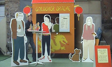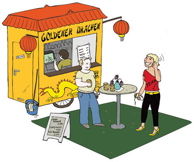 Am Imbissbudenstand wird die Frage diskutiert: "Ist Berlin hässlich?", so wie selbst der Regierende Bürgermeister Klaus Wowereit angesichts der aktuellen Bauprojekte am Alexanderplatz kürzlich befand.