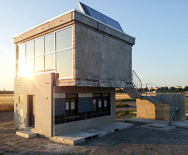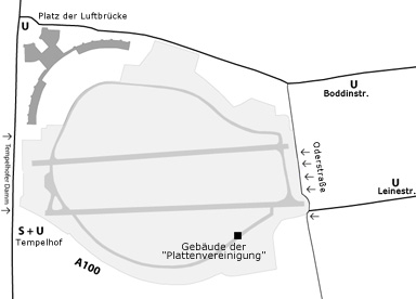 Gebäude der "Plattenvereinigung" - Temporärer Bau von zukunftsgeraeusche, am südlichen Ende des Tempelhofer Feldes auf der Seite Oderstraße (Ost-Seite). Zugang über den Süd-Ost-Eingang Oderstraße – am besten mit dem Fahrrad! Öffentlicher Nahverkehr: U8 U-Bhf Leinestraße (Bus 344 U Leinestraße) - Fußweg über Leinestraße und Tempelhofer Feld (ca. 1.500m).