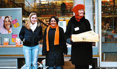 Tulpenverkauf am Valentinstag 14. Februar 2005, Ecke Knesebeckstraße in Charlottenburg, (v.l.n.r.): Schüler der Menzel-Oberschule in Tiergarten, Theresa Keilhacker, Architektin (Veranstaltung "Tulpen für Tische I")